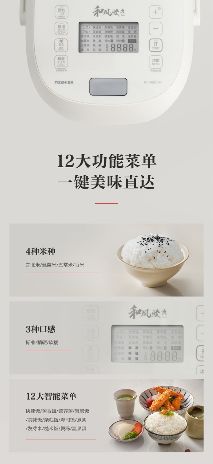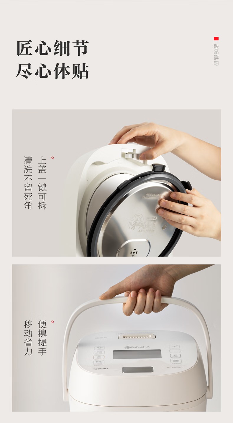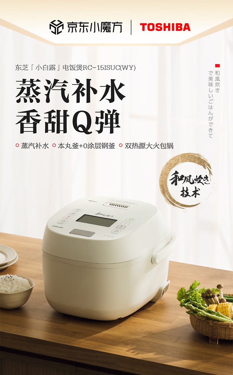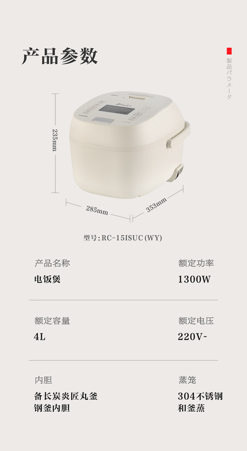 商品名称:(巨邦佑)R+ 东芝(TOSHIBA)电饭煲RC-15ISUC(WY) 小白露0涂层电饭煲3-4人 和风炊蒸汽补水技术 IH立体双热源 一煲两釜 4L 白色