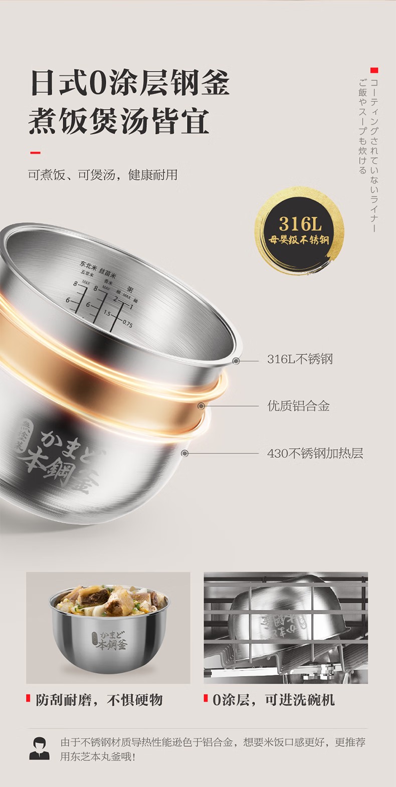(巨邦佑)R+ 东芝(TOSHIBA)电饭煲RC-15ISUC(WY) 小白露0涂层电饭煲3-4人 和风炊蒸汽补水技术 IH立体双热源 一煲两釜 4L 白色