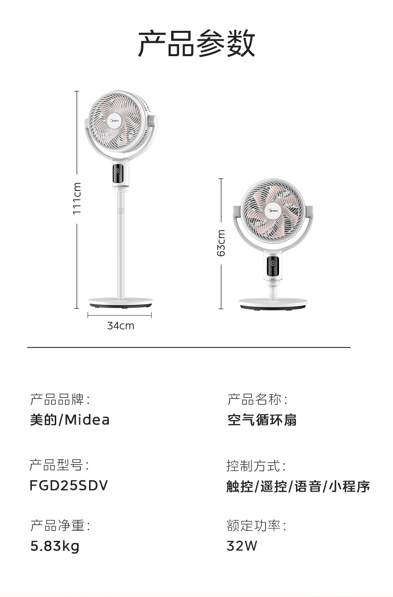 商品名称:(巨邦佑)R+美的(Midea)空气循环扇FGD25SDV节能低噪轻音双扇叶屏显3D蓝牙语音智控遥控落地扇25年新品