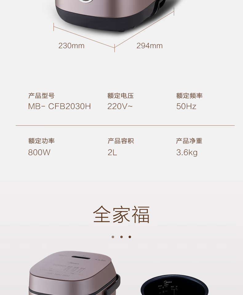 商品名称:(巨邦佑)R+美的(Midea)电饭煲CFB2030H 家用1-2人小容量2L立体IH电磁加热小型多功能迷你煮饭锅智能预约电饭锅