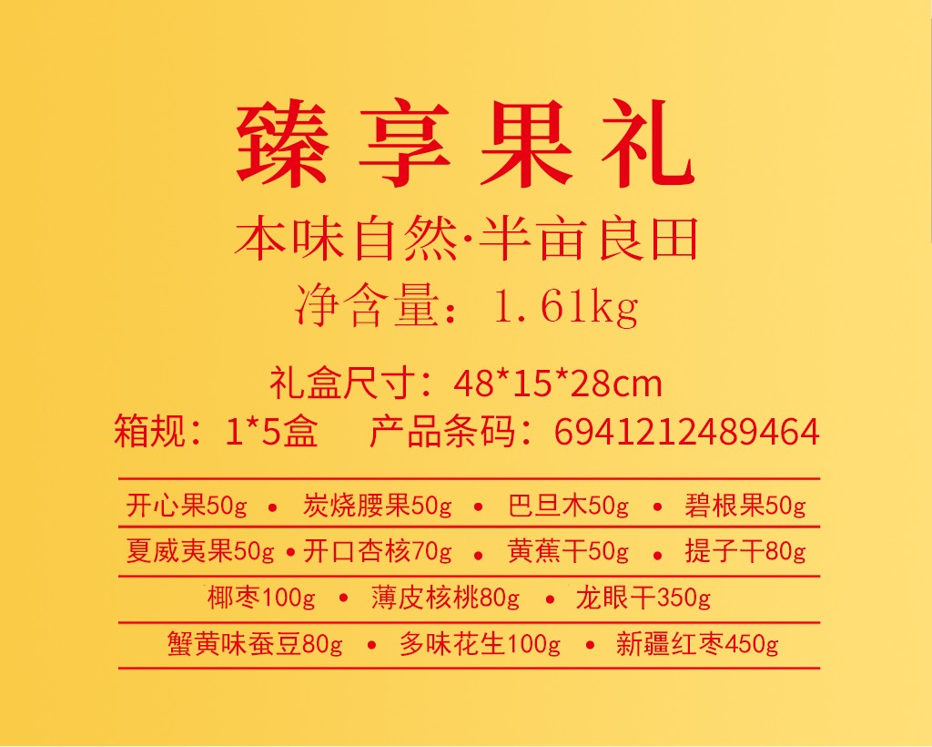 商品名称:(巨邦佑)R+半亩川臻享果礼1610g 腰果夏威夷果椰枣提子干礼盒